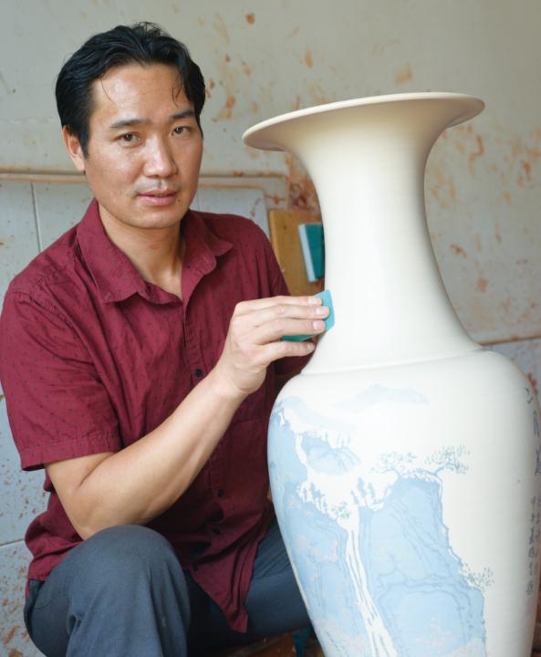 2002年,刘国全开始从事建水陶制作,先后师从于云南省工艺美术大师马成林、紫陶拉坯传承人潘庆邦,掌握了装饰、设计、拉坯、造型等工艺。绘画和书法,是陶工艺的重要部分。传统建水陶的绘制讲究绘制者的审美修养和书画功力,往往会请书画名家来承担,从一个侧面反映了绘制工艺对于传统建水陶艺术的重要意义。在建水制陶业界,集制陶工艺与书法为一身的业者不多,刘国全正是这样难得的精英。自己设计、制作、绘制,能更加精准地表现作品的主题和审美。主创刘国全制陶、书法显身手,也给“天德陶庄”增添了独特魅力。