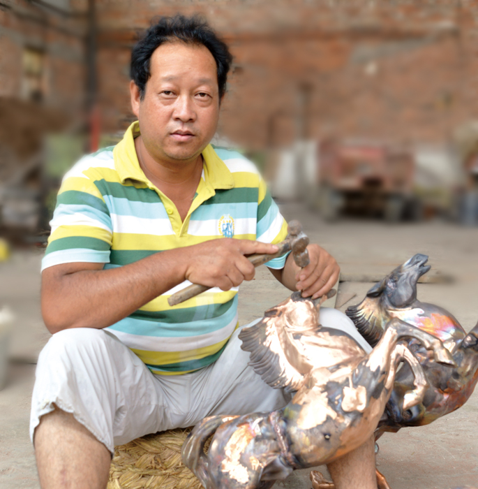 杨汉升,1972年出生,从事铸造工艺品10余年,江川县前卫镇宏丰铜器工艺铸造厂厂长。